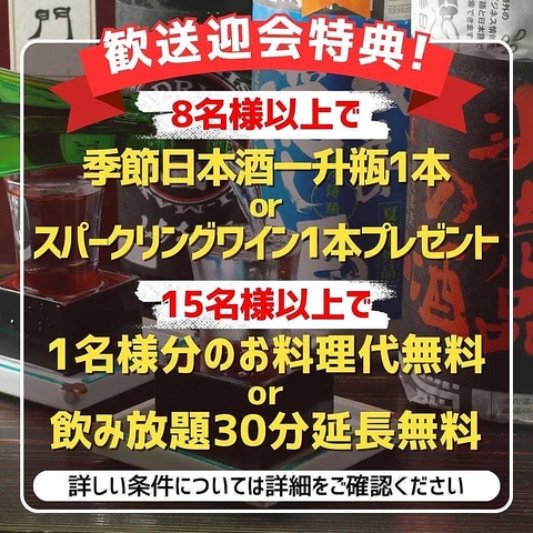 各種宴会におすすめの特典をご用意♪人数にあわせて、下記のいずれか一つをお選びいただけます。(併用不可)【8名様以上なら】季節日本酒一升瓶 or スパークリングワイン1本プレゼント!【15名様以上なら】幹事様や主賓の方1名様のお料理代無料! or 飲み放題30分延長無料(飲み放題付コースに限ります) ※詳細はクーポンをご確認ください