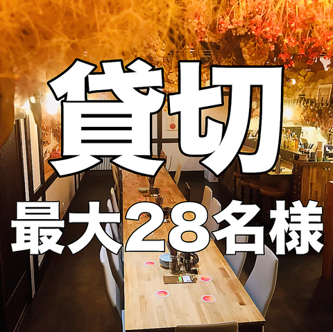 【2階個室貸切は15名様~最大28名様まで】【3階個室貸切は2名様~最大20名様まで】女子会、デート、お祝い、宴会など様々なシーンでお使いいただけます♪3階個室はスタッフが来ないセルフ飲み放題となっており、普通の個室よりもさらにプライベート感満載のお部屋です。インテリアのドライフラワーに癒されます。