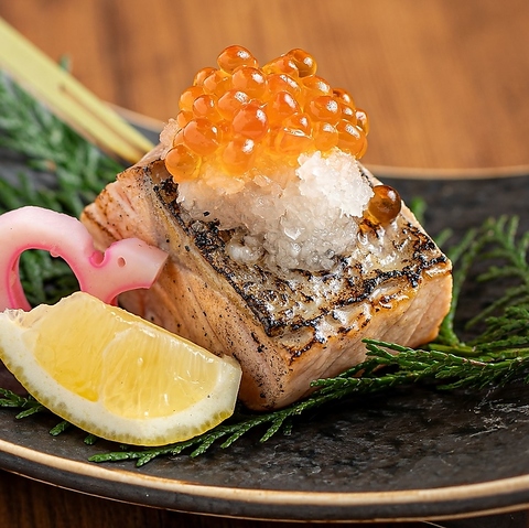 絶品!とろサーモンといくらの親子焼き 串を立てて焼くことにより脂が火に落ちずススがつかない焼き方です。遠赤効果が最大限に活かされ、素材に旨味がぎゅっと閉じこもります。魚介も肉も野菜も鮮度にこだわり!他にも様々な海鮮料理がございます。西新駅すぐの居酒屋でのご宴会の際には、ぜひご利用ください。