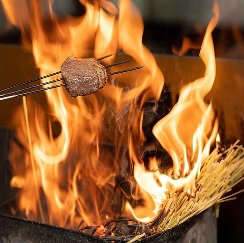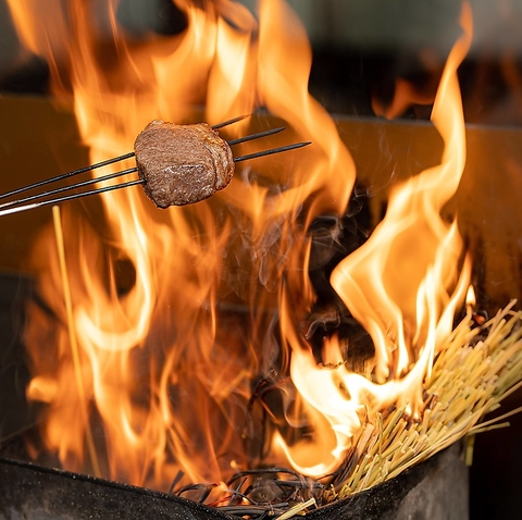 糸島の農家から仕入れる藁を使って食材の表面をさっと炙ります。さらに藁の煙をかけて藁薫に。ほのかに薫る藁の香りが食材の旨味をぐっと引き立てます。一瞬で燃え尽きる高温の藁は燃えた後に煙を出します。この魔法の燻煙が食材にコクと旨味を乗せてくれます。西新駅からすぐの、こだわりのある個室居酒屋です。