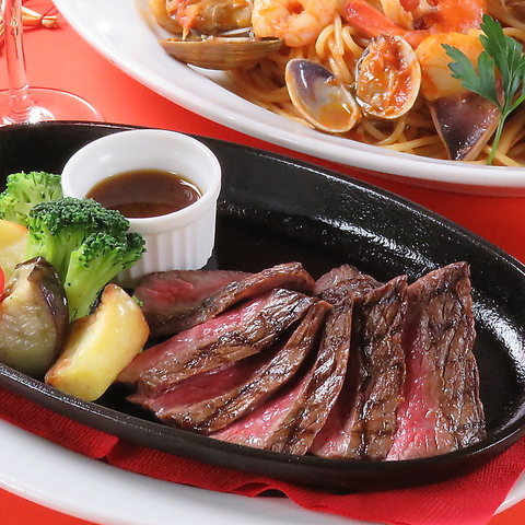 赤身の旨味が味わえる アツアツ鉄板のステーキ。セットで自家製パンかライスを選べて サラダ付き。