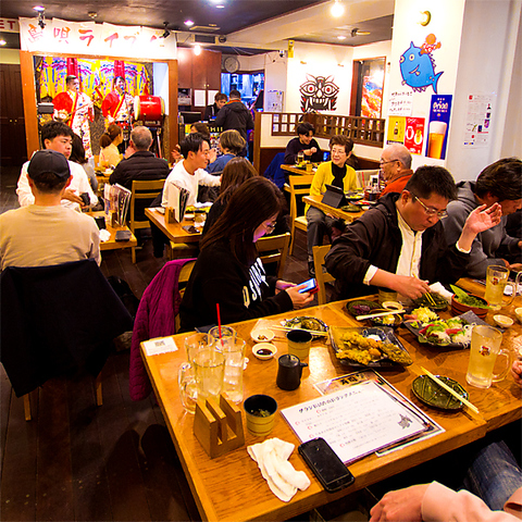 沖縄民謡・島唄三線ライブは、観覧無料で毎日開催!店内席は全席オープンフロアなので、お客様皆様で大盛り上がりです!