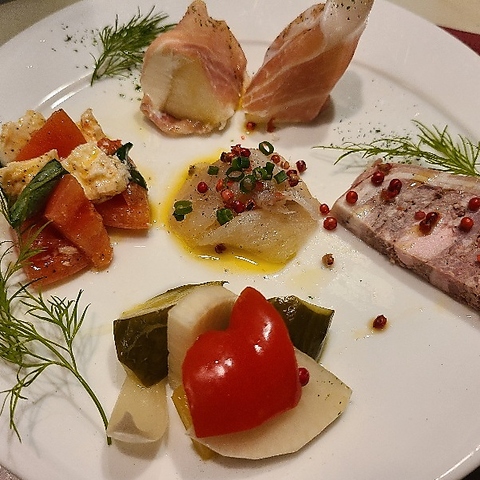 ・前菜の盛り合わせ・温かい前菜・パスタ・お魚料理・雛鶏丸ごとロースト・ドルチェ