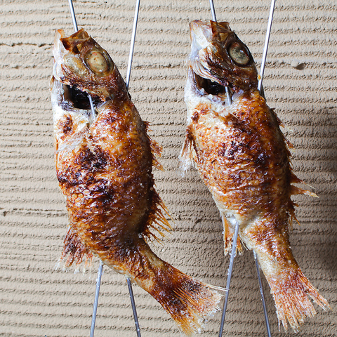 白身魚の王様「のどぐろ」は、炉端で丁寧に焼き上げる一本焼きがおすすめ。天然塩と脂の旨みが最高です。
