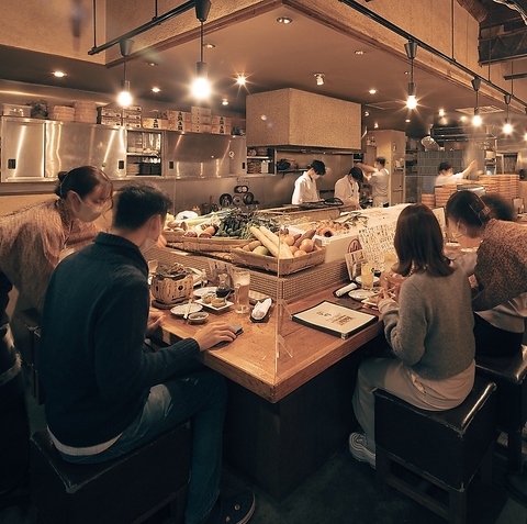 鮮魚や野菜がズラリと並び、賑わいのあるカウンター席。その日のおすすめや、石川の地酒についてもお気軽におたずねください!