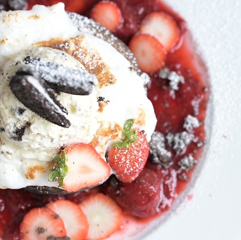 贅沢なブラックココア生地に、たっぷりのクッキー&クリーム、甘酸っぱい苺、自家製マシュマロをトッピング。みんなが大好きな要素を詰め込みました。