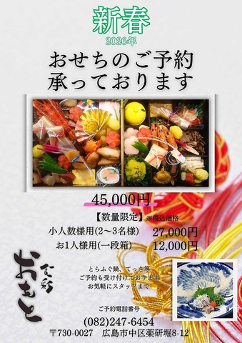 新年度を彩る、食彩おもとのおせち各種。人数によってお選びいただける重箱各種ご用意いたします。詳しくはスタッフまで、お気軽のお問い合わせください。