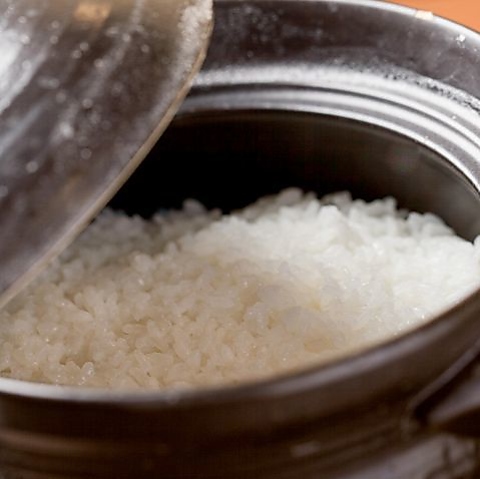 北海道産「ゆめぴりか」のお米を使用、土鍋にてふっくらホカホカに。お肉と合わせると、止められない。
