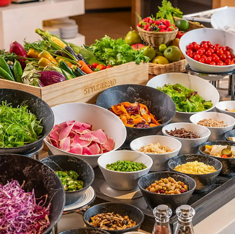 ビュッフェコーナーでは千葉県産野菜をたっぷりとご用意したサラダコーナーや野菜の旨味を活かした野菜料理等を提供する他、肉や魚料理にシェフのこだわりが詰まった料理をご用意しております。