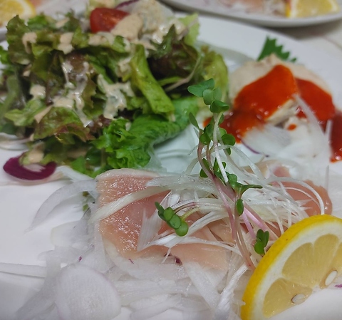 育生に手間暇かけた絶品地鶏。備長炭で丹念に炙り上げた風味豊かな地鶏たたき。満足間違いなし!