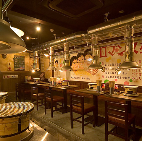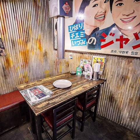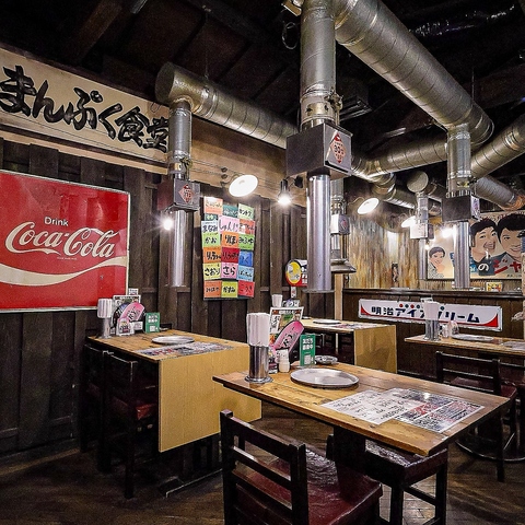 <4名様 × 1>4名様からご利用いただけるテーブル席をご用意しております。店内全てオープン席となっており、仲間たちだけでなく、周りの方とも一緒に盛り上がれるようなワイワイ楽しめる雰囲気のお席となっております。当店自慢のホルモンを是非お楽しみください。店内の至る所に昭和の香り漂うレトロな装飾が満載です!