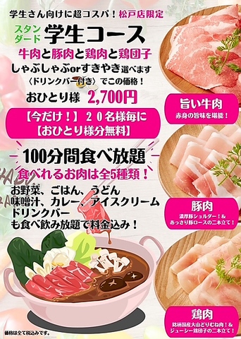 学生限定コース100分食べ放題は3コース!2400円2700円3300円!ドリンク、アイスクリームバー付き!