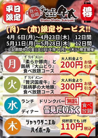 4月6日(月)~23日(木)、5月11日(月)~28日(木)にて曜日別お得サービス開催!