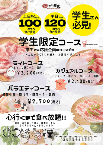 しゃぶしゃぶORすき焼きからお選び頂ける食べ放題の3コースがあります【牛肉,豚ロース、豚バラ、鶏もも】は2200円(税込)他。土日祝日もOK!アイスバー付シニア幼児料金あり。お肉のgが決まった定量コース1150円税込~ご用意御座います。☆ランチタイムはドリンクバ-別料金