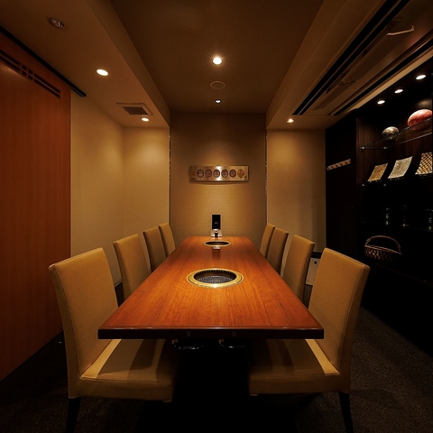 和モダンの落ち着いた空間。少人数~大人数までシーンに合わせて幅広くご利用いただけるお席をご用意しております。団体様でのご宴会や会食、接待などのビジネスシーンにもご利用いただけます。また、カウンター席もございますので、一人焼肉を贅沢に楽しむこともできます。隣り合わせのお席は大切な方とのデート利用にもおすすめです。