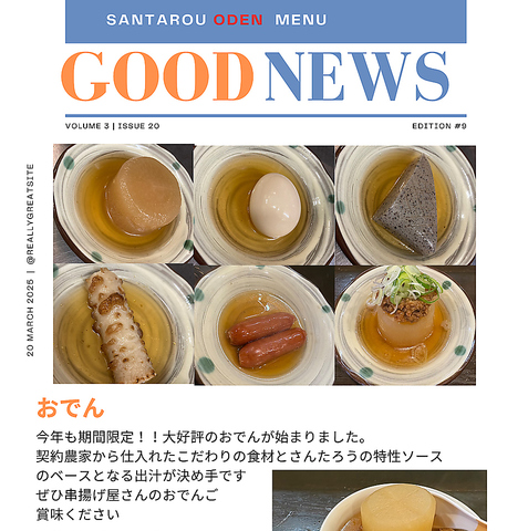 リピート率90!!毎年大人気危機感限定。こだわり出汁で作る串揚げ屋さんのおでん。期間限定この冬はさんたろうでおでんです。