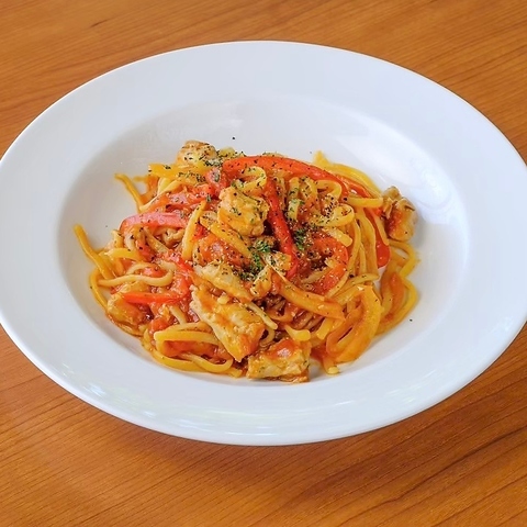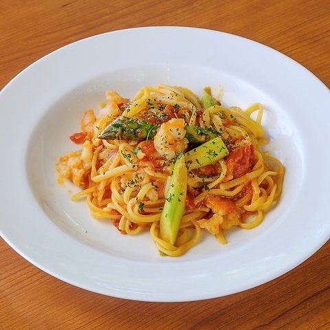 ぷりぷりの海老を使ったピリ辛のトマトソース。