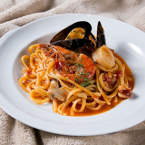 海鮮を贅沢に使った自慢のペスカトーレ。トマトソースに滲み出た海の香りは絶品。様々な海の幸をお楽しみ頂けます。