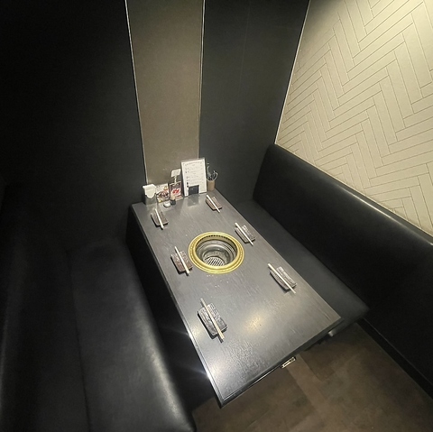 黒を基調とし、間接照明と調光ライトで照らされたモダンな個室空間。映える高級感の中、厳選和牛を焼き上げ、特別な焼肉体験を。貸し切りや宴会でもご利用頂けます。