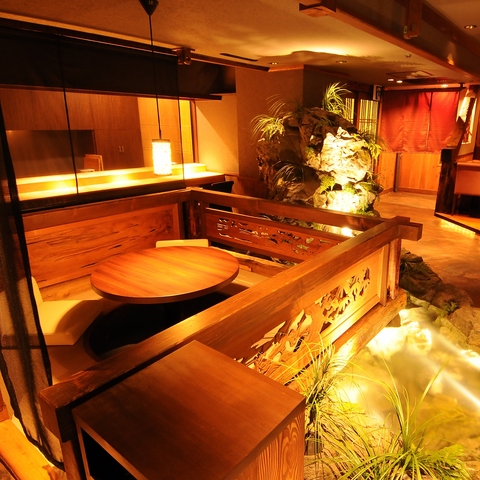 川の音を聴きながら楽しめる半個室の席。落ち着いた照明と川の音はまさに癒しの空間です。人気のため、お早めのご予約をお薦め致します。