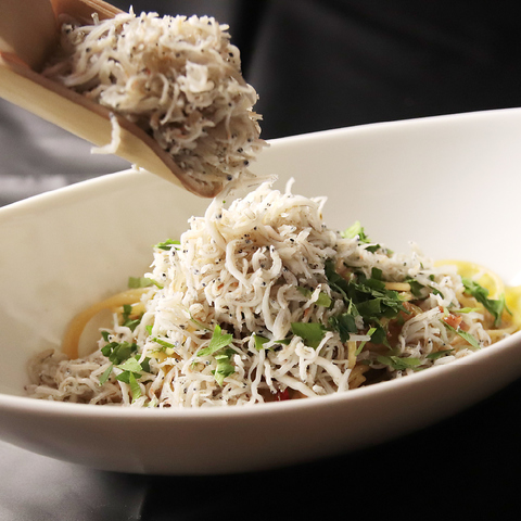 目の前でしらすを盛り仕上げます。山盛りしらすを混ぜてお召し上がりください!ニンニクを揚げてオイル漬けにしたものをかけると悪魔的においしくなります!