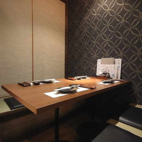【テーブル完全個室:4~6名様】 和のテイストをふんだんにあしらったこちらの空間は、空間の奥には、坪庭をイメージしたおしゃれなスペースもございます。普段の食事会、宴会はもちろん、接待やお祝い事など、大切な方をもてなすお食事会にもおすすめの、プレミアムな空間です。