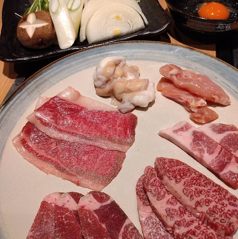 厳選したお肉(タンカルビ、黒毛和牛2種、小腸、もみじ豚肩ロース、赤鶏セセリ、小腸)を自慢の自家製割下でお召し上がりください。野菜、たまご、ライスor〆うどん付き※画像は1人前です。