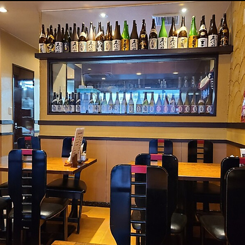 1階ダイニングに所狭しと立ち並ぶボトルの数々。焼酎・日本酒など、各種銘酒を取り揃えております!