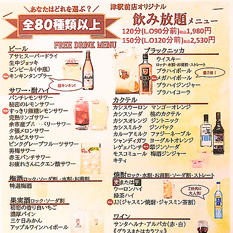 キンキンビールやJJ・ノンアルコールドリンクなどなど!全80種類以上の圧倒的ラインナップでご用意!