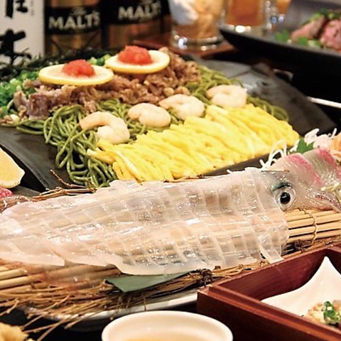 活きイカはもちろん宇部牛石焼ステーキ、土火土火瓦そばなども味わえる。皆で美味しい料理とお酒を囲もう。