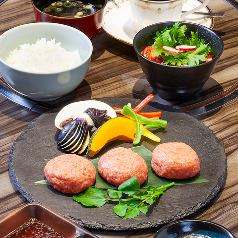 ハンバーグ(100g)&・焼肉・焼野菜・サラダ・ご飯・スープ・ドリンク・デザート付