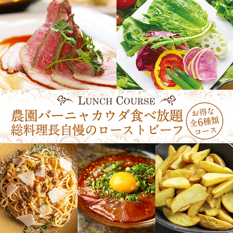 - ランチタイムは全てのお食事メニューにバーニャカウダのお野菜食べ放題、ドリンクバー、お好きなデザート(+550)を付けることができます。