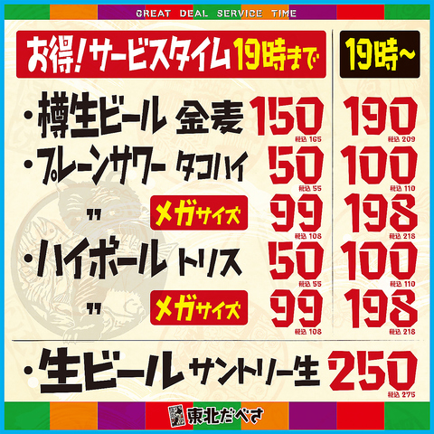 19時以降も東北だべさでは生ビールが275円と超お得!二次会や三次会など、飲み会利用にぜひ♪