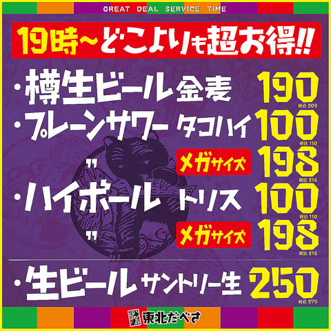 19時まで各種ドリンクが超お得に♪サワー&ハイボールが55円~、メガサイズは99円!