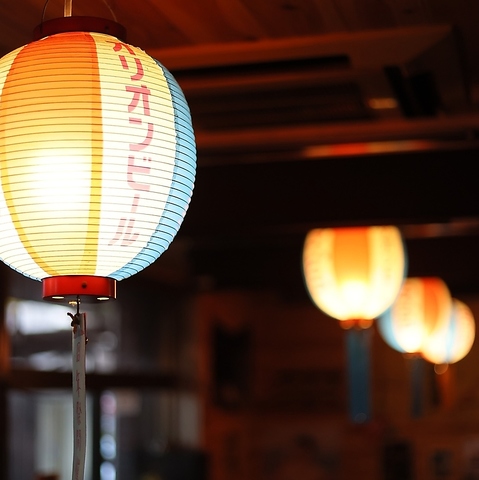 夕方には店先の赤ちょうちんに灯がともります。まさに沖縄の大衆居酒屋の雰囲気抜群!!扉を開けて一歩、入るとそこはもう別世界。オリオン提灯や暖簾、そしてズラッと並ぶ宮古の泡盛が沖縄の雰囲気を醸し出しています♪