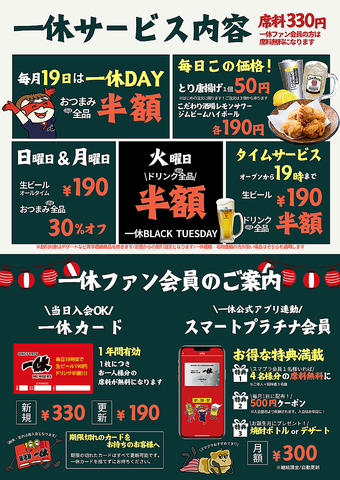 フラッと気軽に足を運べる、大衆感漂う店内!居酒屋一休は、少人数から団体様、ご友人同士の飲み会や各種宴会まで幅広いシーンでご利用いただけます☆みんなでワイワイ楽しむなら一休!皆様のご来店を心よりお待ちしています♪