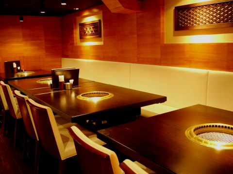 ダウンライトの落ち着いた空間でゆったり焼肉。お友達と、ご家族と、ゆったりしたい御食事に♪
