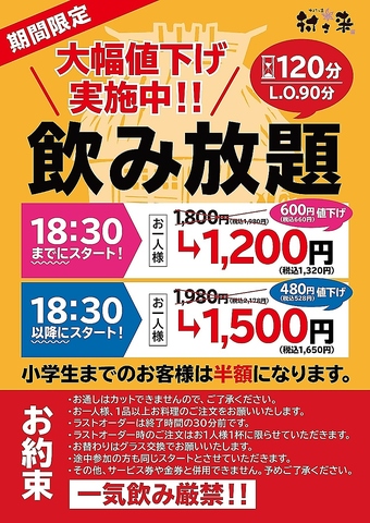 | 料金 | 大幅値下げ実施中★18時半迄のご入店で1980円→1320円(税込)、以降の時間は2178円→1650円(税込)!! 期間限定★めっちゃ!!お得♪ |