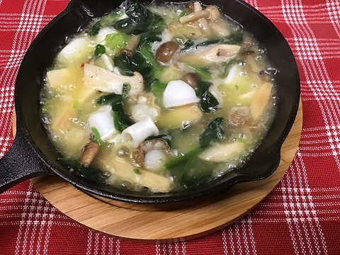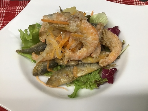 旬の素材を使用したアヒージョです。今の季節は海老、イカ、キノコのアヒージョ!季節の旬によって食材は変わります!!新鮮な食材を贅沢に使った逸品です。バケットに載せて頂くと美味しさが倍増します。濃厚な素材のエキスがたっぷりつまった風味をお楽しみください♪