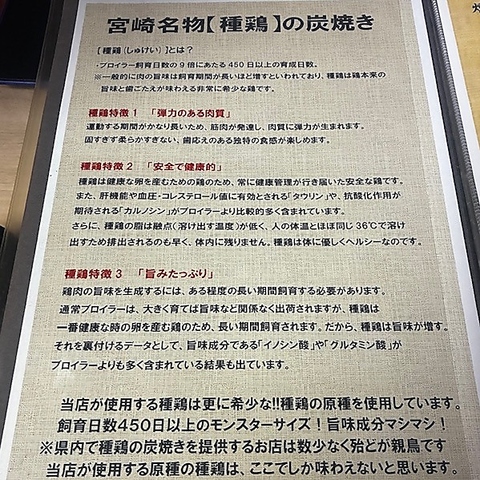 本場の味を勉強しました。県内ではほぼ取り扱いの無い希少鶏、種鶏の炭火焼き!当店でしか味わえない本場の味をご賞味ください♪ オリジナル・オリジナルガーリック爆弾・種鶏(しゅけい)・種鶏ガーリック爆弾の4種類