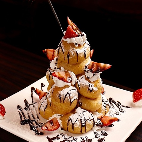 お誕生日や記念日に嬉しい、シュークリームタワーサービスもございます。伝えたいメッセージをプレートに再現OK、ご予約時又はクーポンにてお伝え下さい。