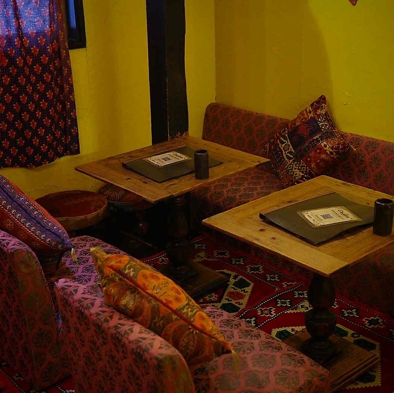 古い家屋を再生し中東スタイルにアレンジしたくつろぎの異空間。日本の伝統の焼鳥とアラビアンナイトな雰囲気の2Fのソファールーム。靴を脱いで寛ぐ『おうちスタイル』です。店内にはアンティークな置物があり、実際に海外で購入したオブジェやランプなどで雰囲気抜群。