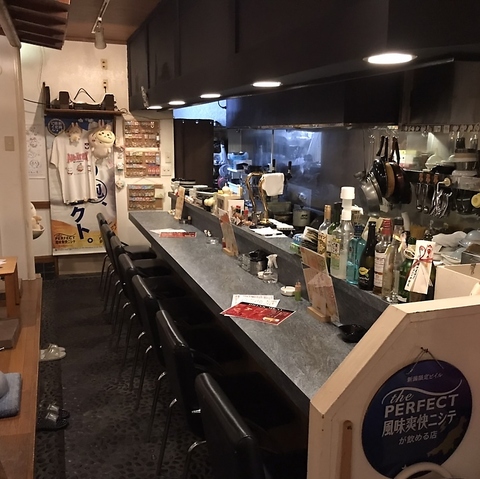 柔らかいシートなのでおひとり様でも寛げるカウンター席。ひとりでゆったり飲むもよし、店主や常連さんとの会話を愉しむもよし。