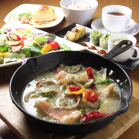 【大きな季節のサラダ/彩り野菜の前菜三種盛(本日のスープ/季節の生春巻き/旬の彩り野菜の前菜)/メインの肉or魚料理(A~Cでお選びください)/ドリンク/2色ご飯(白米/五穀米)/デザート(E~Iでお選びください)】※2色ご飯は、白米のみ、五穀米のみ、バケットに変更可。※糖質制限したいお客様には豆腐ご飯もどきにも変更可