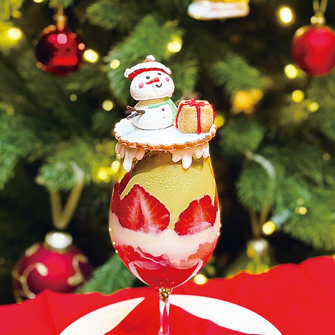 甘酸っぱいいちごに、濃厚なピスタチオアイスとチョコアイス、サクほろのシュトロイゼルを重ねました。仕上げに、ふんわり可愛い雪だるまメレンゲをのせた冬限定パフェ。