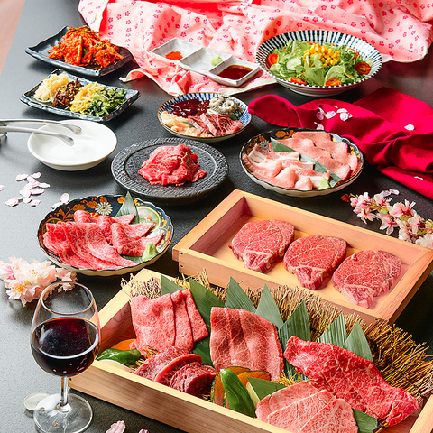 厳選3点盛や特選和牛にぎり、銘柄和牛ロース、神戸牛カルビなど人気メニューに2時間飲放題が付いて7788円~