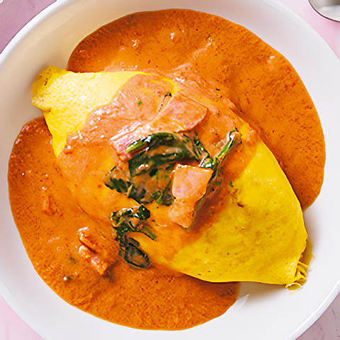 ※写真はベーコンとほうれん草のトマトクリームオムライスです。