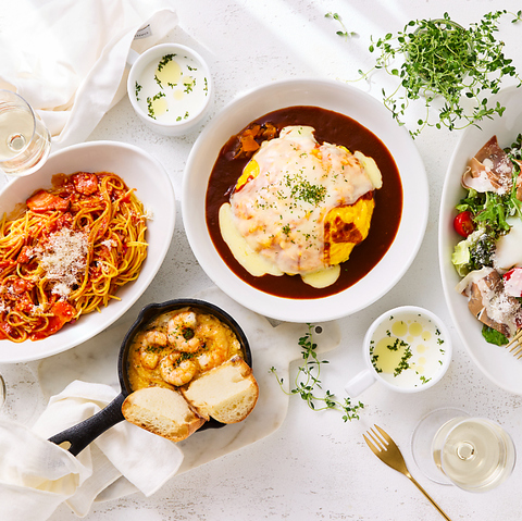 1名様あたり 2189円(税込) ●サラダor冷菜から1品+アラカルトorピザから1品+オムライスorピラフから1品+パスタから1品+スープ&ドリンクバー付