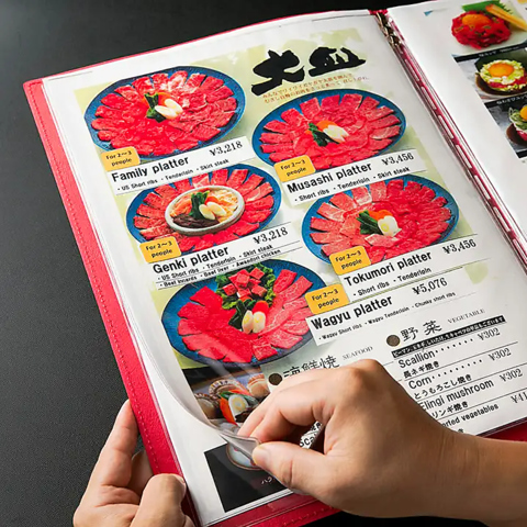 ファミリーや大人数で楽しめる、お得な大皿盛りや厚切りカイノミ、和牛ユッケ、馬刺し、おつまみ系まで多彩なラインナップです。