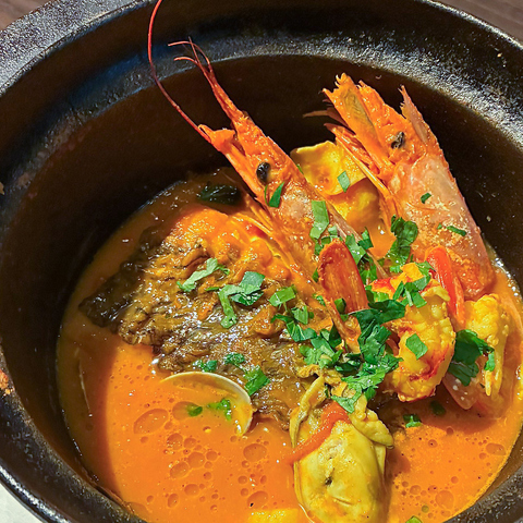 丁寧にとったフュメ・ド・ポワソンとアメリケーヌをベースに、赤エビ、アサリ、ホタテ、つぶ貝、牡蠣など、魚介の旨味たっぷりのスープで温まってください。